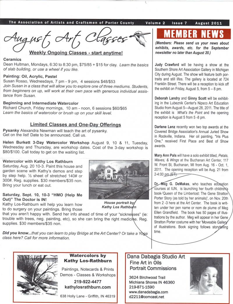 One Woman Show of Gene Stratton Porter as part of a book launch of "Queen of the Limberlost: The Gene Stratton Porter Story (As Told by Her Animals)". There is a Spanish version. This show script is also available in book form, "The One Woman Traveling Show: The Gene Stratton Porter Story".